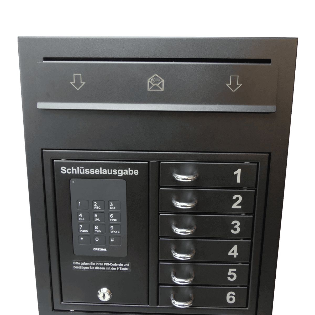 Schlüssel-Übergabesystem KeyBox Pro B (schwarz), stabiler Edelstahl-Zusatzschrank zur Creone KeyBox Serie Basic, mit KeyBox 9006 B Ausgabegerät schwarz Stainless, Edelstahl (ohne Batteriebackup), Codes bleiben auch bei Stromausfall gespeicher. Einfache Programmierung über die Tastatur. Mit Einwurffach für Kunden (Brief-/Schlüsseleinwurf) und Ausgabegeräte B ohne Display. Es können auch Umschläge für den schriftlichen Kundenauftrag entgegengenommen werden. Ein frontseitig montiertes Ausgabefach aus Plexiglas bietet Ihnen Platz für die Auftragstaschen.